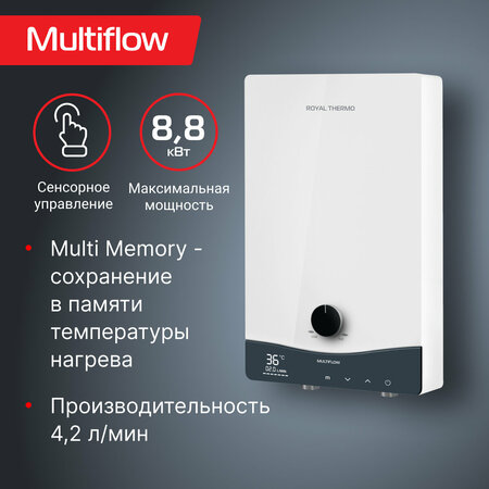 Проточный водонагреватель оснащён LCD-дисплеем с индикацией температуры воды и сенсорным управлением — это абсолютно новый уровень комфорта и безопасности, ведь теперь вы можете программировать индивидуальную температуру нагрева с точностью до 1°С, а благодаря режиму регулировки протока, когда вода достигает заданного пользователем значения, подача воды автоматически отключается. Технология Multi Memory сохранит в памяти прибора индивидуальную температуру нагрева, чтобы вам не приходилось настраивать её несколько раз. Более того, водонагреватель обладает мощным спиральным нагревательным элементом из нержавеющей стали, что предотвращает образование накипи и продлевает срок службы прибора. Multiflow - современный водонагреватель с интеллектуальным управлением и полезными функциями для вашего комфорта и безопасности.