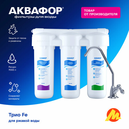 Аквафор Трио Fe проточная система очистки воды под мойку с отдельным краном для чистой воды. Надежно удаляет коллоидное железо, сохраняя минеральный состав воды. Удаляет активный хлор, тяжелые металлы, пестициды, нефтепродукты и другие распространенные загрязнители. Подает чистую питьевую воду на отдельный кран. Картриджи меняются одновременно раз в год. Ресурс 7000 литров. Картридж в комплекте: В510-08, В510-02, В510-07, Очистка воды до 0,7 мкм , Скорость фильтрации 2.5 литра в минуту. Тип сменного модуля 10SL