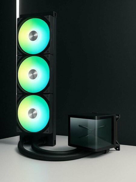 мощная сцепка: 3x 120 мм ARGB-вентиляторов с усиленной гидродинамической системой (до 2000 об/мин) охлаждают эффективно и бесшумно.
