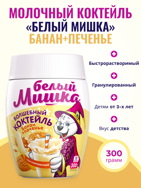Ищете вкусный и быстрый в приготовлении десерт для ребенка? Нежнейший банановый молочный коктейль не оставит равнодушным даже взрослых. Волшебный коктейль Белый мишка очень прост в приготовлении, процесс займет не больше минуты вашего времени. Из сухой смеси можно сделать: коктейль, йогурт и даже соус. Добавьте в стакан молока 5-6 ложек сухой смеси, перемешайте, и вы получите чудо напиток, от которого невозможно оторваться. Если хотите получить пенистый напиток, взбивайте охлажденное молоко с высоким процентом жирности миксером или ручным капучинатором 1-2 минуты. Для приготовления плотного густого холодного напитка можно смешать молоко с мороженым в равных пропорциях. При добавлении смеси в кефир или ряженку получается вкуснейший йогурт, а если соединить смесь со сметаной, вы получите банановый соус, который можно подавать с блинчиками или оладьями.