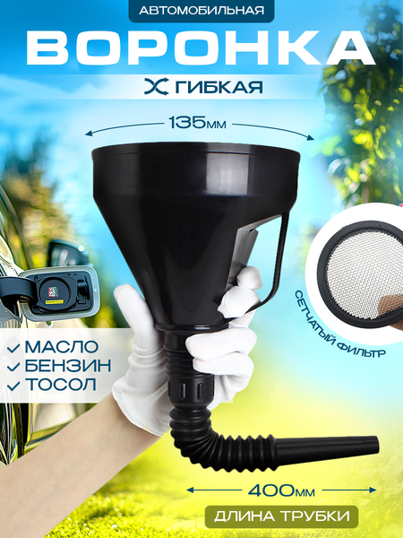 Воронка автомобильная пластиковая для бензина и жидкостей с гибким носиком и сетчатым фильтром, разборная, диаметр 135 мм, длина 400 мм