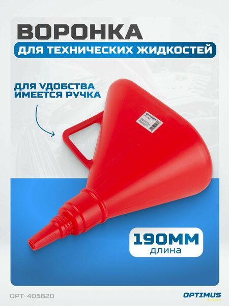 Воронка пластмассовая с гибким носиком-лейкой OPTIMUS OPT-405820 подходит для удобного, быстрого и аккуратного заливания горюче-смазочных материалов. Изготовлена из пластмассы, в комплекте поставляется гибкий носик-лейка , который облегчает работу в труднодоступных местах. Для удобства использования, на корпусе воронки сделана ручка.
