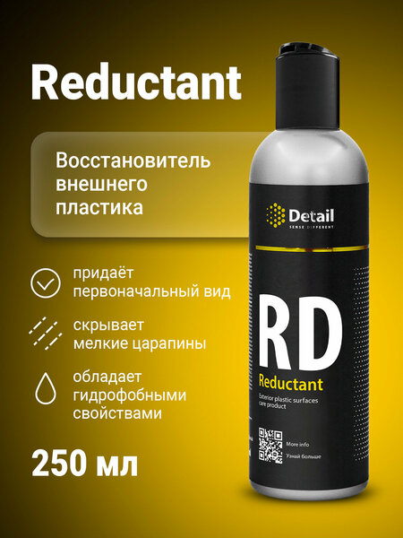 Реставратор пластика, автохимия для пластика RD "Reductant" 250мл от Detail восстановление цвета пластика с предотвращением потускнения. Автокосметика Reductant от Детейл для авто это эффективное полирующее средство для восстановления внешней отделки автомобиля из пластика и резины. Полироль придает первоначальный вид обработанным деталям, скрывает мелкие царапины, обладает гидрофобными свойствами, защищает от выгорания и вредных факторов окружающей среды. Не пенится и не оставляет разводов и жирных следов. Полироль пластика для автомобиля . Восстановитель от Deteil для реставрации внешнего пластика превосходно восстанавливает его первоначальный вид. Обеспечивает длительную защиту от УФ-излучения, выгорания, потускнения, заполняя мелкие царапины и наделяя поверхность антистатическими свойствами. Придает пластику насыщенный черный цвет. Состав на силиконовой основе для ухода за внешним пластиком автомобиля. Так же подходит для резиновых и других пластиковых неокрашенных деталей. Придает деталям первоначальный вид, блеск, маскирует мелкие царапины, работает как чернитель пластика. С восстановителем пластика от Detail вы можете дать своей машине вторую жизнь, пластик автомобиля заблестит как новый и вновь будет радовать вас и близких, сделайте подарок себе и своему авто. Обработанная поверхность приобретает водоотталкивающий эффект и защиту от преждевременного выгорания. Способ применения: 1. Тщательно очистите поверхность или дайте ей высохнуть. 2. Встряхните флакон и нанесите состав на губку или микрофибру. 3. Равномерно распре- делите средство по поверхности круговыми и линейными движениями. 4. Через 5 минут удалите остатки средства с поверхности при помощи сухой и чистой микрофибры. Автокосметика и автотовары от Detail это замечательный подарок и выбор для собственного авто!