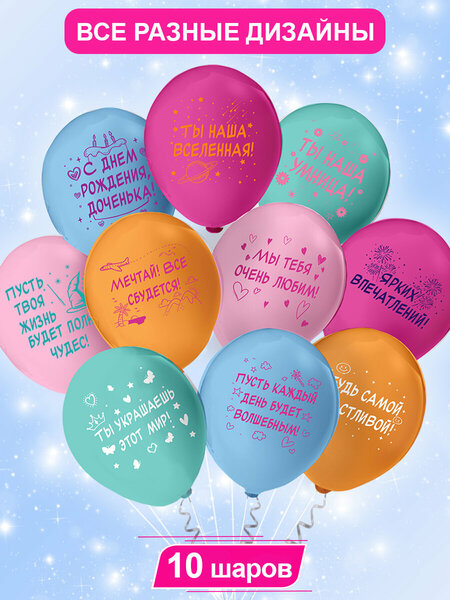 Разноцветные воздушные шары - это отличный подарок для дочки! Подарите вашей девочке незабываемый праздник с нашими латексными воздушными шариками! Эти шарики идеально подходят для дня рождения девочки и создадут атмосферу радости и волшебства. Наши шарики украшены милыми рисунками и надписями, которые обязательно понравятся вашей маленькой дочке. Они изготовлены из высококачественного натурального латекса, что делает их безопасными и экологически чистыми. Эти шарики станут идеальным дополнением к вашему празднику и подарят вашей дочке море радости и улыбок. Создайте незабываемую атмосферу и сделайте день рождения вашей девочки по-настоящему особенным с нашими латексными воздушными шариками! Такой набор шаров с пожеланиями прекрасно дополнит подарок, украсит помещение или фотозону. Яркие разноцветные шарики обязательно понравятся любой имениннице: дочке, внучке, подруге или коллеге. Шары отлично смотрятся в фонтанах или подставках для шаров. В набор входит 10 шаров с разными надписями и пожеланиями. Подходят для наполнения воздухом или гелием. Наши шары станут не только украшением, но и источником позитивных эмоций для вашей дочки. Порадуйте вашу девочку шариками, которые передают все ваши чувства!