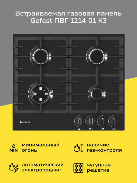 Независимая встраиваемая газовая панель Gefest ПВГ 1214-01 К3 произведена в Беларуси. • Двойная конфорка Доступно четыре конфорки, одна из которых работает с увеличенной мощностью (3,2 кВт), что позволяет быстрее достигать необходимой температуры. • Механический электроподжиг С помощью двух одновременных действий выбранная конфорка зажигается с заданной мощностью, достаточно только нажать и повернуть ручку. • Полная комплектация В наборе идет все необходимое для подключения, в т. ч. жиклеры и штуцер. Размер варочной поверхности равен 600х515 мм. Панель выполнена из эмалированной стали в черном цвете, решетка - составная чугунная. Для установки необходима ниша 558х490 мм в столешнице толщиной от 38 мм. Панель управления размещена снизу. Электропитание осуществляется с использованием сетевого кабеля. Вес - 11 кг.
