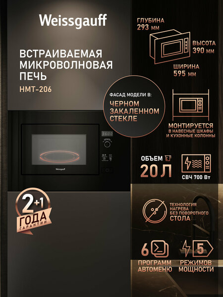 Встраиваемая микроволновая печь Weissgauff в чёрном цвете равномерно разогревает еду без поворотного стола, благодаря системе Spiegel и биокерамическому покрытию White Flat Ceramic. Технология SPIEGEL распределяет энергию в камере более равномерно, позволяя эффективно разогревать еду без использования поворотного стола Биокерамическое покрытие White Flat Ceramic позволяет сохранить в продуктах витамины, минералы и другие полезные вещества, расходуя при этом гораздо меньше энергии на разогрев Компактные размеры устройства позволят установить данную микроволновую печь даже в верхние навесные шкафы, открывая при этом новые возможности организации пространства на вашей кухне! Для встраивания этой модели достаточно всего лишь ниши с габаритами 568 х 303 х 365 мм, что действительно очень удобно! Объем 20 литров дает вам полную уверенность в том, что несмотря на компактные размеры этой микроволновой печи, вы сможете разместить в ней сразу весь необходимый объем пищи Автоменю на 6 программ включает в себя заранее предустановленные режимы для риса, овощей, мяса, пасты, рыбы и разогрева готовых блюд. Разморозка по весу - это опция, с которой вам достаточно всего лишь ввести вес замороженных продуктов до 2 кг и все остальное микроволновка сделает сама, определив продолжительность и интенсивность цикла, чтобы обеспечить равномерный результат без перегретых краев или непроработанных участков внутри. Блокировка от детей, благодаря которой вы всегда сможете избежать ненужных нажатий на элементы управления, например, во время уборки микроволновой печи или, чтобы предотвратить её незапланированное включение детьми. Лёгкость очистки обусловлена внутренним строением камеры: сочетание эмали и биокерамики, а также отсутствие внутренних зазоров делает процесс ухода за моделью лёгким и ненавязчивым Удобный цифровой дисплей с крупной индикацией позволит сделать процесс взаимодействия с микроволновой печью еще более комфортным и простым Сенсорный блок управления это настоящая гордость Weissgauff, ведь он не только является интуитивно понятным, но и великолепно реагирует на прикосновения с первого нажатия даже в том случае, если ваши руки влажные или прохладные Поворотный переключатель Soft Switch с которым вы почувствуете наш по-настоящему немецкий подход к созданию надежной и качественной бытовой техники в каждом его повороте Автоматическая кнопка открывания дверцы позволит вам всего одним легким движением руки получить доступ к рабочей камере микроволновой печи Дизайн, выполненный в черном закаленном стекле, станет финальным штрихом в совершенстве великолепного облика этой модели. Каждый раз, взаимодействуя с вашей микроволновой печью от Weissgauff, вы будете чувствовать, что это не только функциональное устройство, но и настоящее украшение вашей кухни!