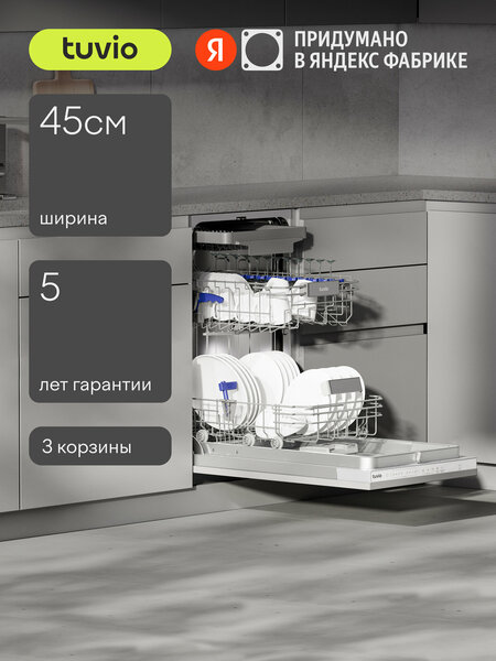 Tuvio — это бренд удобной бытовой техники, придуманный в Яндексе. Tuvio DB43MT8LS1 — это посудомоечная машина шириной 45 см. Подходит как для просторной, так и для небольшой кухни. Машина вместительная и функциональная: для 10 комплектов посуды есть 3 корзины, верхнюю можно регулировать по высоте даже в загруженном состоянии. В корзине для столовых приборов вилки, ложки и ножи тщательно промываются. С внутренней подсветкой машину легко загружать или проверять качество мытья сразу после открытия дверцы. Благодаря удобному сенсорному управлению можно точно настроить работу машины. Для мытья посуды есть 8 режимов разной интенсивности. В авторежиме машина сама определяет степень загрязнения и подбирает нужные параметры для работы. Третий разбрызгиватель подаёт воду сверху — вся посуда промывается более тщательно. Машину не обязательно загружать полностью: в режиме Dual Zone можно выбрать только одну корзину для мытья. Максимальный расход воды на цикл работы — 8,5 л — меньше, чем при ручном мытье. В дополнительном режиме экстрасушки посуда быстро сохнет без разводов и капель. С функцией отложенного старта машину можно запустить в любое удобное время. Цикл работы легко отследить по лучу, который проецируется на пол во время мытья. По окончании дверь открывается автоматически — так воздух циркулирует внутри камеры, а посуда сушится более эффективно. Продуманная технология Aqua Stop защищает устройство от протечек: в случае прорыва шланг прекращает подачу воды.