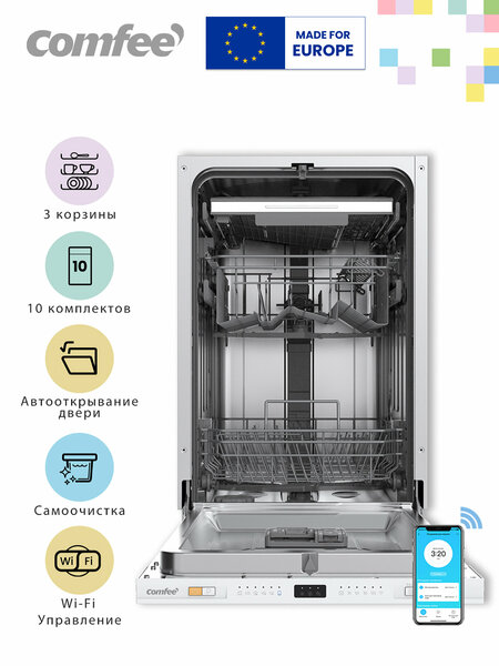 Встраиваемая посудомоечная машина Comfee CDWI453i с Wi-Fi - это компактное и функциональное устройство, которое станет незаменимым помощником на вашей кухне. Эта модель имеет большую вместимость 10 комплектов посуды, что делает ее идеальным выбором для больших семей. 8 автопрограмм* Comfee CDWI453i оснащена электронным управлением и 8 программами мойки, включая быструю, гигиеническую при температуре 70°C, деликатную для стекла, интенсивную, программу самоочистки и ЭКО-программу. Это позволяет выбрать оптимальный режим для каждого типа посуды и степени ее загрязнения. Конденсационная сушка обеспечит быстрое и эффективное удаление влаги с поверхности посуды после цикла мойки. *Больше программ доступны в приложении CloudWash функциональность CDWI453i оснащена функцией автооткрывания двери и 3 корзинами для посуды с возможностью регулировки средней корзины. Модель также обладает функцией использования средств 3-в-1, что значительно упрощает процесс мойки посуды и экономит ваше время. Wi-Fi управление Управление посудомоечной машиной возможно со смартфона c помощью приложения, что позволяет запускать ее дистанционно и контролировать расход воды и электроэнергии, а также предоставляет доступ к еще большему количеству программ. Кроме того, посудомоечная машина интегрирована с умной колонкой Алиса, что дает вам возможность управлять устройством посредством голоса. отсрочка старта Одним из преимуществ данной посудомоечной машины является наличие отсрочки старта от 3 до 12 часов, которая позволяет запустить машину в любое удобное для вас время, включая ночное. умная индикация И безопасность использования Индикация проинформирует вас о неисправностях, наличии соли и наличии ополаскивателя для обеспечения максимального комфорта использования. Посудомоечная машина оснащена автоотключением после окончания цикла мойки, автоотключением при отсутствии воды и защитой от протечек, гарантируя полную безопасность использования. энергоэффективность Модель имеет класс энергопотребления A, что говорит о ее энергоэффективности. Расход воды составляет всего 9 литров за цикл, а максимальная потребляемая мощность - 1800 Вт. компактность И эргономичный дизайн Несмотря на свою вместительность, Comfee CDWI453i отличается компактными размерами и лаконичным дизайном. Белый цвет корпуса позволяет посудомоечной машине гармонично вписаться в любой интерьер кухни. Встраиваемая посудомоечная машина Comfee CDWI453i - это стильное, функциональное и надежное устройство, которое облегчит вам процесс мытья посуды.