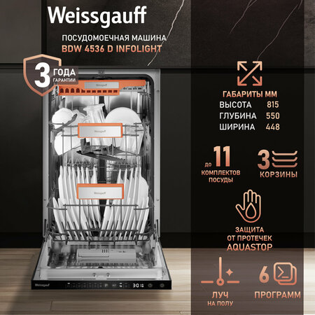 Встраиваемая посудомоечная машина с лучом на полу Weissgauff BDW 4536 D Infolight, 3 корзины, 11 комплектов