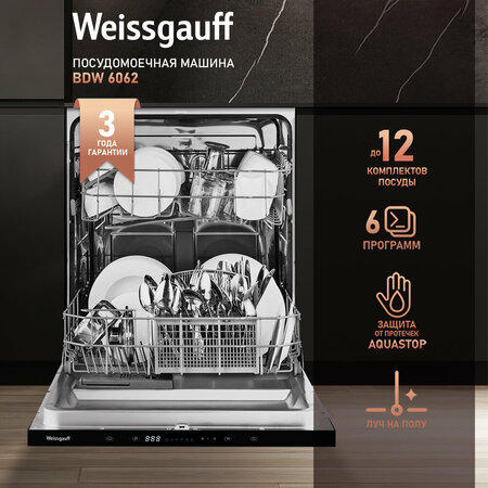 Полноразмерная и вместительная встраиваемая посудомоечная машина Weissgauff, рассчитанная сразу на 12 комплектов посуды, обладает всеми необходимыми опциями для наилучшего результата после каждого рабочего цикла загрузки. Луч на полу дополнит прекрасный набор возможностей этой модели. Технологичные разбрызгиватели воды обеспечивают наилучшее качество мытья, а современная панель управления с удобным цифровым дисплеем сделает работу с данной моделью еще более удобным. До 12 комплектов посуды одновременно вы можете расположить в данной посудомоечной машине, что позволяет справиться со всем необходимым объемом работы за один раз Функция "Луч на полу", позволяющая определить, завершила ли посудомойка свой цикл работы, не открывая при этом дверцу! Половинная загрузка, благодаря которой вы сможете помыть даже самое небольшое количество посуды, не расходуя воду и электричество больше, чем это необходимо. Быстрый режим, позволит вам управиться еще оперативнее: всего за 30 минут машина проведет мойку и ополаскивание. Данный режим идеально экономит ваше время и подходит для той посуды, которая не требует сушки Режим "90 минут", это гарантия великолепного результата за четко определенный заранее срок! Интенсивная программа великолепно расправится даже с самыми сложными загрязнениями, гарантируя великолепный результат после каждого запуска! Режим "Стекло", прекрасно подойдет для стеклянных стаканов, тарелок, бокалов, фужеров и прочего, обеспечивая одновременно бережное обращение с помещённой посудой и отсутствие разводов на стекле после завершения цикла мойки Экономичная программа подойдет для тех, кто хочет помыть посуду с низким уровнем загрязнений, не расходуя при этом излишне много воды! Стандартная программа подойдет для посуды среднего уровня загрязненности, в том числе, кастрюль, тарелок и бокалов! Таймер на 24 часа, который особенно удобен, если вы хотите начать цикл мытья в ночное время или во время вашего отсутствия. Всего лишь загрузите посуду в камеру, нажмите одну единственную кнопку - и всё остальное машина сделает сама! Полностью электронное управление, интуитивно понятное даже человеку, никогда ранее не работавшему с подобной техникой, сделает процесс запуска быстрым и лёгким. Удобный цифровой дисплей с крупной индикацией позволит сделать процесс взаимодействия с посудомоечной машиной еще более комфортным и простым Возможность дозагрузки посуды, на начальном этапе мойки будет особенно удобна в случае, если вы забыли поместить в машину забытую на столе кастрюлю или тарелку! Полная защита от протечек AquaStop, обеспечит на 100% уверенность в том, что и вы, и ваши соседи снизу, будете полностью защищены от затопления даже в случае повреждения шланга или гидроудара.