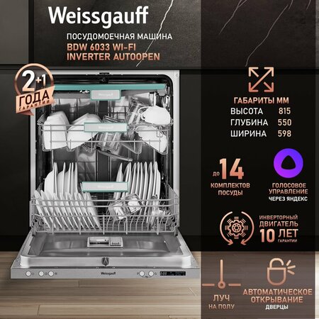 Полноразмерная посудомоечная машина Weissgauff, оснащенная Wi-Fi модулем управления, инверторным двигателем и функцией автоматического открытия дверцы, не только удивит богатством функциональных решений, но и обеспечит идеальный результат: 3 корзины позволят расположить посуду оптимальным образом для достижения наилучшего качества мытья, а наличие 7 программ для мытья позволит подобрать оптимальный режим в зависимости от количества посуды и степени загрязнения. Корзины в дизайне "ECO LIFE" с легендарным узнаваемым оттенком зеленого цвета, отражают концепцию экологичности подходов Weissgauff к созданию бытовой техники! Забота о здоровье пользователя, безопасность используемых материалов и безукоризненно высокое качество мытья посуды - все это реализовано в данной модели посудомоечной машины! Три корзины, позволяющие разместить отдельно от остальной посуды в верхнем лотке сразу все ложки, вилки и ножи, обеспечивая при этом их наилучшее мытьё. Автоматическое открывание дверцы AutoOpen - по окончании цикла позволяет воздуху циркулировать естественным образом, обеспечивая в несколько раз более высокую эффективность сушки, чем у любой другой системы с закрытой дверцей. Функция "Луч на полу", позволяющая определить, завершила ли посудомойка свой цикл работы, не открывая при этом дверцу Wi-Fi модуль с управлением через мобильное приложение, выведет удобство управления вашей посудомоечной машиной на новый уровень! Всего лишь скачайте приложение для вашего смартфона через специальный QR-код, размещенный в инструкции, и наслаждайтесь современным и удобным управлением вашим устройством! Голосовое управление через Яндекс. Алиса позволит Вам включать и выключать посудомоечную машину, ставить её работу на паузу, а также выбирать требуемую программу мытья, даже не вставая с места! До 14 комплектов посуды одновременно вы можете расположить в данной посудомоечной машине, благодаря современным продуманным и эргономичным корзинам, которыми Weissgauff оснастили эту модель. Половинная загрузка, с возможностью выбора верхней или нижней части камеры, благодаря которой вы сможете помыть даже самое небольшое количество посуды, не расходуя воду и электричество больше, чем это необходимо. Опция Turbo Speed+ подойдет для тех пользователей, которые ценят своё время! Применение данной функции существенно сокращает продолжительность мытья, обеспечивая быстрый и качественный результат! Интенсивная программа великолепно расправится даже с самыми сложными загрязнениями, гарантируя великолепный результат после каждого запуска! Режим "Стекло", прекрасно подойдет для стеклянных стаканов, тарелок, бокалов, фужеров и прочего, обеспечивая одновременно бережное обращение с помещённой посудой и отсутствие разводов на стекле после завершения цикла мойки. Режим "90 минут", это гарантия великолепного результата за четко определенный заранее срок! Автопрограмма Blitz Wash поможет вам, в том случае если вы затрудняетесь с выбором программы мойки. Просто выберите авторежим, и посудомоечная машина, с помощью датчиков и сенсоров самостоятельно определит степень загрязненности вашей посуды и выберет оптимальный температурный режим и интенсивность мытья Экономичная программа подойдет для тех, кто хочет помыть посуду с низким уровнем загрязнений, не расходуя при этом излишне мног