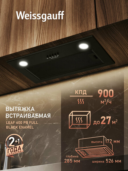 Полностью встраиваемая вытяжка, выполненная в дизайне врезного блока с панелью из эмалированной стали стильного черного цвета и оснащенная интуитивно понятным кнопочным управлением, воплощает в себе один из основных принципов Weissgauff: "Качество, доступное каждому!" Впечатляющая производительность 900 м3/ч позволит эффективно и бескомпромиссно справиться с задачей по очистке воздуха на вашей кухне! Эффективная работа в помещении площадью до 27 м2 - это гарантия того, что после установки вытяжки Weissgauff, обновление воздуха будет соответствовать всем требуемым нормам, сохраняя ваше здоровье на долгие годы! Низкий уровень шума 59 дБ сделает работу с данной вытяжкой по-настоящему комфортной и приятной, ведь мы в Weissgauff знаем, как добиться высокой производительности без лишнего шума! Дизайн, выполненный в эмалированной стали черного цвета станет финальным штрихом в совершенстве великолепного облика этой модели. Каждый раз, заходя на кухню, вы будете чувствовать, что эта вытяжка - не просто функциональное устройство, но и настоящее украшение вашей кухни! Кнопочный блок управления интуитивно понятный даже пользователю, никогда ранее не работавшему с подобной техникой, сделает работу с этой вытяжкой поистине удобной и приятной! Работа в режимах отвода и циркуляции откроет вам широкие возможности по установке этой вытяжки в проект вашей кухни. Организуйте полноценный вывод воздуха из помещения или установите угольный фильтр и используйте вытяжку вместе с ним - какой бы вариант вы ни выбрали, модель от Weissgauff сделает это возможным! 3 скорости работы двигателя дают вам возможность выбрать наиболее подходящий уровень интенсивности в зависимости от ситуации Алюминиевый жировой фильтр особой трёхслойной конструкции, с асинхронным расположением решёток, эффективно защитит двигатель от жира и испарений, продлив срок службы устройства. LED освещение, представленное двумя экономичными и яркими лампами, дает возможность создать более комфортные условия на кухне и использовать эту вытяжку как дополнительный источник кристально чистого света. Возможность установки угольного фильтра станет отличным решением для вытяжки, работающей в режиме рециркуляции, позволяющим повысить эффективность очистки воздуха и избавиться от нежелательных запахов!