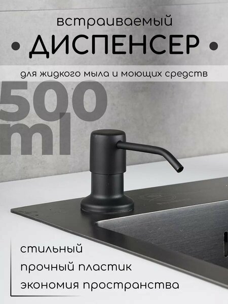 Встраиваемый механический дозатор для жидкого мыла и моющих средств - диспенсер с функцией подачи моющего средства из емкости при помощи рычага. Встраиваемый кран размещается в кухонную мойку или столешницу с помощью винтового крепления. Колба с моющим составом размещается под столешницей, на раковине остается только эстетичный рычаг с носиком. Движение жидкости из резервуара наружу обеспечивает механизм с помпой. Один из плюсов конструкции - экономичность расхода за счет того, что при нажатии выдается небольшая порция. Идеально подходит в качестве дозатора мыла для рук , дозатора средства для мытья посуды для кухонной раковины или любого мыла, моющих средств, шампуня и кондиционера. Преимущества встраиваемого диспенсера: Компактность. Диспенсер для мыла не занимает много места. Стильный внешний вид. Благодаря своей лаконичности дозатор моющего средства вписывается в любой дизайн помещения. Надежность и безопасность. Устройство выполнено из нержавеющей стали. Поверхность устойчива к коррозии. Простота обслуживания и эксплуатации. Изготовлен из высококачественной нержавеющей стали и прочного пластика. Диспенсер для моющего средства идет объемом 350 и 500 мл.