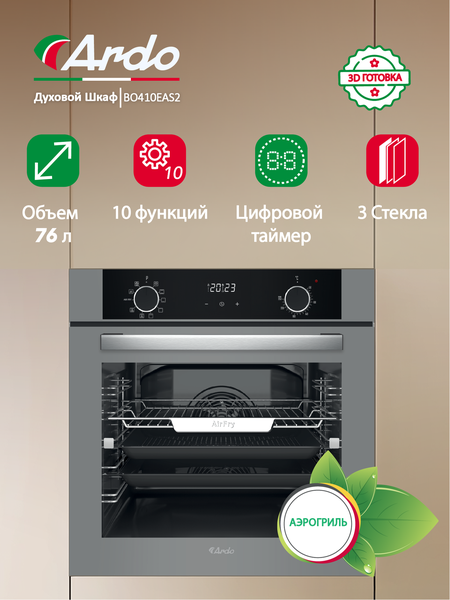 Встраиваемый духовой шкаф Ardo BO410EAS2 - идеальное решение для вашей кухни. С объемом 76 литров и 10 режимами работы, этот духовой шкаф способен удовлетворить все ваши кулинарные потребности. Он оснащен функцией аэрогриля AirFry с технологией Cycle Pro, позволяющей готовить блюда с минимальным количеством масла, обеспечивая при этом хрустящую корочку и насыщенный вкус.