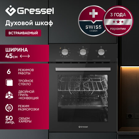 Ищете компактный, но функциональный духовой шкаф? Gressel U4ES16000 идеально подойдёт для небольшой кухни или студии. Благодаря ширине 45 см и объёму камеры 50 л, он не займёт много места, при этом позволяя готовить любимые блюда без компромиссов. Выполненный в чёрном стекле, он легко впишется в современный интерьер. Модель предлагает 6 базовых режимов: от классического верхнего+нижнего нагрева до гриля с конвекцией, что удобно для запекания мяса, выпечки и создания хрустящих блюд. Механический таймер на 120 минут упрощает контроль: по истечении заданного времени духовка автоматически отключается, а звуковой сигнал напомнит о готовности. Тройное стекло дверцы повышает безопасность, а вентилятор охлаждения защищает мебель от перегрева. Хромированные направляющие позволяют удобно перемещать противень, а внутренняя поверхность с эмалью лёгкой очистки упрощает уход. Дополнительно предусмотрены поворотные ручки управления с чёткими обозначениями, что понравится любителям классических решений. Если вы ищете надёжный и стильный духовой шкаф для регулярной готовки на небольшой кухне, Gressel U4ES16000 станет отличным выбором, сочетая простоту эксплуатации и необходимые функции.