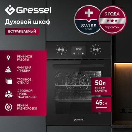 Любите чёрный цвет и современный дизайн? Gressel U4ES59000 — это миниатюрный духовой шкаф на 45 см в стиле TOTAL BLACK. Благодаря объёму 50 л он уместит полноценный противень или форму для выпечки, что важно для тех, кто не хочет жертвовать функциональностью при ограниченном пространстве. Этот шкаф поддерживает 9 режимов работы: от классических верхнего и нижнего нагревов до функции «Пицца» и режима разморозки. Конвекция улучшает циркуляцию горячего воздуха, помогая равномерно пропекать выпечку или запекать мясо. Цифровой таймер рассчитан на 10 часов, а система автоотключения обеспечивает безопасность. Хромированные направляющие делают перестановку противней лёгкой, а дверца с тройным стеклом защищает от высоких температур. Поворотные ручки управления с понятной разметкой и встроенные часы на дисплее создают удобство при ежедневной эксплуатации. Вентилятор охлаждения защищает фасады кухни, продлевая срок их службы. Если вам важно сочетать эстетику и универсальность, Gressel U4ES59000 подойдёт как нельзя лучше: он привнесёт выразительный акцент в интерьер и будет радовать надёжностью и продуманным функционалом.