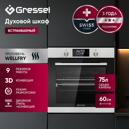 Оцените Gressel U6EM69110: сочетание нержавеющей стали и чёрного стекла создаёт современный вид, а объём 75 л и 9 функций (гриль, пицца, разморозка, конвекция) позволяют готовить как сложные блюда, так и быстрые закуски. Цифровой таймер-программатор помогает контролировать время, а система автоотключения заботится о безопасности. Утапливаемые ручки управления обеспечивают минималистичный вид, а один уровень телескопических направляющих делает извлечение горячего противня удобным. Двойное стекло дверцы удерживает тепло, а мощность около 3100 Вт обеспечивает ровный нагрев. Внутренние стенки покрыты эмалью лёгкой очистки, упрощающей удаление пригоревших пятен. Функция «Быстрое приготовление» пригодится для занятых, а «Разморозка» ускорит процесс подготовки продуктов. Gressel U6EM69110 впишется в интерьер с акцентом на нержавеющую сталь и современную технику. Эта модель предлагает простор для экспериментов и подойдёт тем, кто ищет эффективный, стильный и надёжный духовой шкаф для семьи и гостеприимных вечеров.