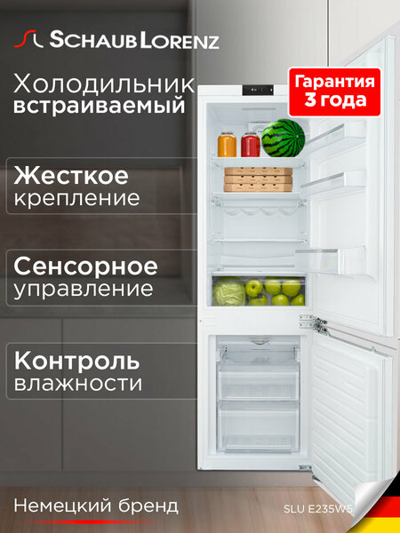 Встраиваемый холодильник Schaub Lorenz SLU E235W5 с двумя камерами и общим объёмом 243 л обладает такими преимуществами, как: Цифровой сенсорный дисплей – удобная настройка температуры и дополнительных опций. Жесткое крепление Door-on-Door более долговечное и простое в монтаже. Оно обеспечивает плавное закрытие, не ограничивает угол открывания дверцы и выдерживает более тяжелые по весу фасады. Верхняя и боковая LED-подсветка. Функциональность: холодильная камера наполнена четырьмя прочными полками из закаленного стекла и пластиковым ящиком для овощей и фруктов, также на дверце находятся три полки. В морозильной камере расположены три прозрачных пластиковых ящика. Благодаря контролю влажности «Humidity control» овощи и фрукты дольше остаются свежими. Удобная полка для бутылок. С системой разморозки «No Frost» в морозильном отделении и капельной системой разморозки в холодильном отделении вы забудете об образовании льда на задней стенке холодильника и самостоятельном размораживании. Перенавешиваемые двери: больше не надо думать в какой угол поставить холодильник, потому что вы всегда можете перевесить двери, как вам удобнее. Низкий уровень шума (41 дБ) по сравнению с отдельно стоящими холодильниками, а после встраивания в шкаф он может стать ещё меньше. Антибактериальное покрытие: покрытие с содержанием ионов серебра защитит внутреннюю поверхность холодильника от грибка и неприятных запахов.