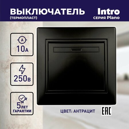 Выключатель Intro Plano 1-101-05: стильный и надежный выбор Выключатель Intro Plano 1-101-05 выполнен из качественного негорючего термопласта, что обеспечивает его долговечность и безопасность использования. Цвет антрацит придает ему элегантный и современный вид, который легко впишется в любой интерьер. Одноклавишный выключатель оснащен винтовыми клеммами, обеспечивающими удобный и надежный монтаж. Вертикальное расположение клемм позволяет соединять соседние выключатели шлейфом, что упрощает процесс установки и экономит время. Установка выключателя возможна как на монтажные лапки, так и на винты, что позволяет выбрать наиболее удобный способ монтажа. Выключатель Intro Plano 1-101-05 имеет класс защиты IP20, что гарантирует защиту от попадания твердых предметов размером более 12 мм и от проникновения воды. В комплект поставки входит одноместная рамка и винтовые клеммы, что позволяет сразу приступить к установке и подключению выключателя. Выбирая выключатель Intro Plano 1-101-05, вы получаете стильный, надежный и функциональный продукт, который обеспечит комфортное и безопасное использование электроустановок в вашем доме.