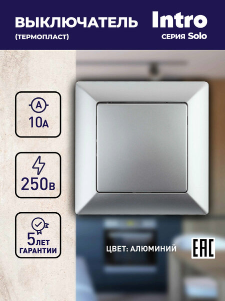 Выключатель 1-клавишный серии Intro Solo скрытой установки цвет алюминий 4-101-03. Номинальные характеристики 10А 250В . Выключатель выполнен из качественного негорючего термопласта, укомплектован одноместной рамкой, оснащён винтовыми клеммами. Вертикальное расположение клемм обеспечивает удобный и надёжный монтаж. Клеммы с двумя отверстиями позволяют соединять соседние выключатели шлейфом. Установка в подрозетник производится как на монтажные лапки, так и на винты. Для установки 2-х и более выключателей в несколько подрозетников в ряд дополнительно используются многоместные рамки: 2-х постовая - 4-502-хх, 3-х постовая 4-503-хх, 4-х постовая - 4-504-хх (где хх - цветовой код: 01 - белый, 02 - слоновая кость, 03 - алюминий, 04 - шампань, 05 - антрацит, 10 - венге, 11 - сосна).