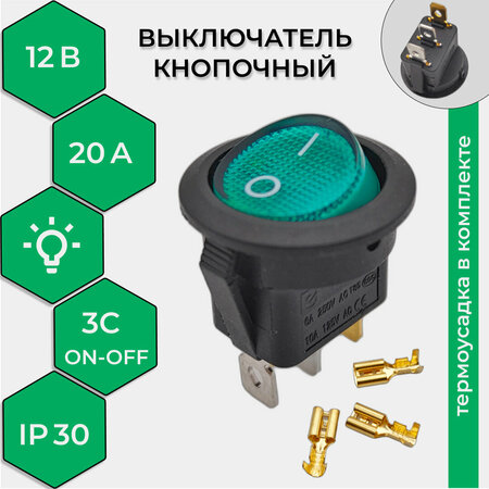 Выключатель клавишный круглый 12V 20А (3с) ON-OFF зеленый с подсветкой предназначен для коммутации электрических цепей напряжением 12В. Клавишные (Рокерные) выключатели применяются в качестве комплектующих изделий различного электрооборудования (аудио-оборудовании, блоках питания, электроустановках на различных производствах, автомобилях, и многих других местах). Такой клавишный переключатель имеет два положения. Принцип действия основан на перемещении клавиши в одну из позиций. Для переключения в нужное положение требуется приложить некоторые усилия на клавишу. Монтаж осуществляется без применения винтов на плоских панелях толщиной от 0.8 мм до 3 мм. Подключение контактов осуществляется плоской клеммой, либо с помощью пайки.