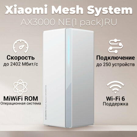 Xiaomi Mesh System AX3000 NE — Wi-Fi-роутер с поддержкой технологии Mesh. Устройство позволяет объединять несколько моделей в единую сеть, обеспечивая быстрое и стабильное подключение. Роутер имеет лаконичный дизайн, который станет стильным акцентом в интерьере. На задней панели расположены четыре гигабитных Ethernet-порта. Xiaomi Mesh System AX3000 NE поддерживает технологию Wi-Fi 6 и предлагает несколько гигабитных портов Ethernet, обеспечивая гигабитную скорость подключения как для беспроводных, так и для проводных устройств. Подключитесь к высокоскоростной гигабитной сети с низкой задержкой по всему дому с помощью Xiaomi Mesh System AX3000 NE. Устройство поддерживает беспроводное подключение со скоростью до 3000 Мбит/с и автоматически переключается между двумя диапазонами Wi-Fi для стабильной работы сети. Благодаря встроенной памяти объёмом 256 МБ роутер способен одновременно подключать до 250 устройств. Модель покрывает большую площадь и передаёт сигнал через толстые стены. Переключение между узлами Mesh-системы происходит автоматически и без проблем. Для настройки роутера используется удобное мобильное приложение Mi Home, где можно управлять всеми подключёнными смарт-устройствами. Xiaomi Mesh System AX3000 NE оснащен 4 гигабитными портами Ethernet и поддерживает агрегацию портов локальной сети и автоматическое определение WAN/LAN для обеспечения надежного подключения и неограниченного удобства. Комплектация адаптер питания, документация, кабель Ethernet