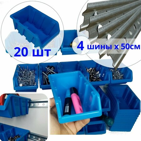 Лоток для метизов 1л 20шт, металлическая шина 50см 4шт, синий