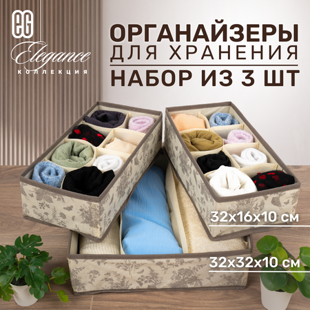 Стильный и удобный набор из 3-х органайзеров для белья и небольших элементов одежды EG Elegance сохранит в вашем шкафу идеальный порядок и поможет правильно организовать пространство. Использование органайзеров для хранения избавит от поиска вещей и сэкономит время. Органайзеры можно легко расположить на полке в шкафу, гардеробной. В комплект входят: - 2 органайзера, каждый размером 32х16х10 см. Изделия имеют мягкие перегородки внутри, разделяя пространство на 8 секций. - 1 органайзер размером 32х32х10 см, который включает в себя 3 секции. В сложенном виде стеллажные органайзеры практически не занимают места. При необходимости легко собираются с помощью молнии на дне, а раскрываясь, приобретают жесткую форму за счет картонных бортов. Органайзеры для хранения небольших элементов одежды изготовлены из нетканого полотна, которое защищает вещи от пыли, грязи и волос. Современный материал не препятствует микроциркуляции воздуха, благодаря чему белье легко проветривается, а влага не скапливается. В органайзере удобно хранить небольшие элементы одежды, нижнее белье, галстуки, ремни, перчатки, шарфы, шапки.