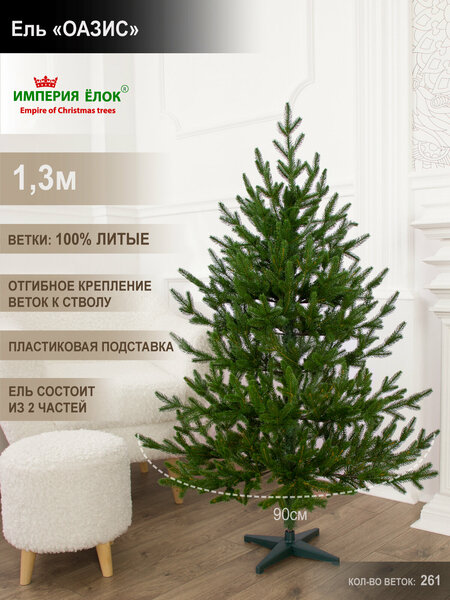 Елка искусственная новогодняя литая «Оазис» для семейного праздника на Новый год и Рождество высотой 130 см (высота с учётом подставки). Такая елка — это прекрасный вариант для оформления вашего интерьера к Новому году. Небольшая елка отлично подойдет для украшения детской комнаты, гостиной в доме или ресепшен в вашем офисе. Тип елки: 100% литая. Диаметр нижнего яруса 90 см. Высота от пола до нижнего яруса 25 см. Крепление веток: отгибное. Чтобы собрать нашу компактную искусственную елку, достаточно соединить 2 части дерева между собой, и ветки сами займут горизонтальное положение. Подставка: пластиковая. Упаковка: плотная коробка, в которой можно хранить ель 1.3 м между праздниками. Искусственная елка на Новый год наполняет каждый дом сказочным теплом и новогодним волшебством. Новогодняя искусственная ель высотой 1,3 м прекрасно подойдет для украшения и декора фотостудии или офиса. Невысокая напольная елка подходит для детей и детского праздника, потому что не имеет запаха и абсолютно гипоаллергенна. В производстве елок данного типа для ветвей и ствола используется натуральная краска на водной основе без химических составляющих. При распаковке и сборке елки возможно небольшое осыпание красочного слоя. Но это происходит один раз, и далее вы весь сезон наслаждаетесь вашей красавицей без вреда для здоровья. Новогодняя маленькая елочка 130 см не колется и не мся. Она смотрится совсем как настоящая ель. Густая хвоя не осыпается и не пах, а иголки мягкие. Это отличный вариант, если вы хотите купить невысокую елку для помещения. Пышная хвоя будет радовать вас на новогодние праздники много лет. Красивая елка украсит ваш дом на Новый год и Рождество. Чтобы увидеть весь ассортимент, нажмите на логотип Империи Елок и перейдите в наш магазин. Искусственная ель высотой 1,30 м прекрасно подойдет для любой квартиры или офиса.