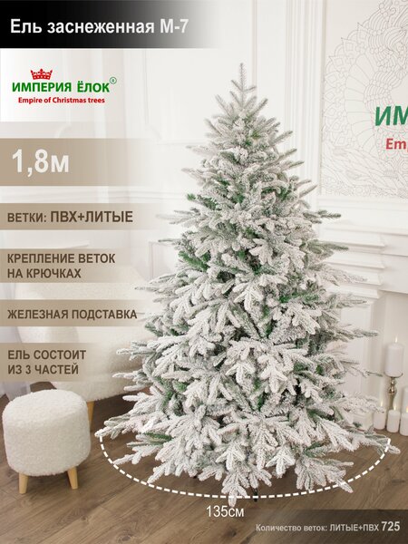 Представляем вам заснеженную искусственную новогоднюю елку из серии «М-7» высотой 180 см (высота с учётом подставки). Такая нарядная елка ста украшением вашего дома во время новогодних праздников и создаст особую атмосферу зимней сказки. Елка изготовлена из высококачественных материалов: литые ветки (иголки) + пленка ПВХ (основание веток и ствол). Высота белой елки вместе с подставкой: 1.80 м. Диаметр нижнего яруса 130 см. Крепление веток- на крючках. Подставка: металлическая устойчивая. Упаковка: плотная коробка. Снег наносится с помощью электричества. Очень приятное на ощупь, это напыление смотрится гораздо нарядней, чем обычный снег. Елка состоит из 3 частей. Вам нужно соединить их и вставить ветки в пазы, далее придать веточкам естественный вид. Крепкое основание выдержит вес новогодней елки с большим количеством украшений. Напольная елка 1,80 м легко собирается и разбирается, что позволяет вам быстро создать праздничную атмосферу и без проблем хранить ее после окончания праздников. Новогодняя елка 180 см не колется, не мся и смотрится совсем как настоящая ель. Густая хвоя и снег не осыпаются и не пахнут, а иголки мягкие. Допустимо небольшое осыпание в процессе распаковки и сборки, что является нормой. Это отличный вариант, если вы хотите купить невысокую елку со снегом для помещения. Пышная хвоя будет радовать вас на новогодние праздники много лет. Красивая елка украсит ваш дом на Новый год и Рождество. Большая напольная елка подходит для детей и детского праздника, потому что она не имеет запаха и абсолютно гипоаллергенна. Чтобы увидеть весь ассортимент, нажмите на логотип Империи Елок и перейдите в наш магазин. Новогодняя искусственная ель высотой 1.80 м прекрасно подойдет для любой квартиры или офиса.
