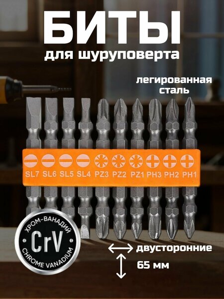 Биты для шуруповерта ЕРМАК - это двусторонние биты, изготовленные из легированной Cr-V стали. Этот материал обеспечивает высокую прочность и долговечность, что делает их незаменимыми помощниками в строительных и ремонтных работах. Биты имеют длину 65 мм, что позволяет использовать их с большинством моделей шуруповертов. Набор включает в себя 10 различных типов наконечников: PH1, PH2, PH3, PZ1, PZ2, PZ3, SL4, SL5, SL6 и SL7. Это позволяет использовать биты для работы с различными видами саморезов, болтов и других крепежных элементов. В целом, биты для шуруповерта ЕРМАК - это надежный и функциональный инструмент, который станет незаменимым помощником как для профессионалов, так и для любителей.