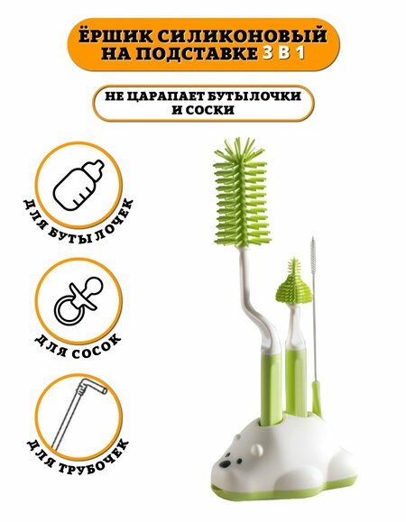 В комплекте: два ершика с силиконовой щетиной ершик для трубочек (соломок) сушилка (подставка) для ершиков Большой ершик предназначен для мытья любых бутылочек, малый ершик для мытья сосок. Ершик для бутылок имеет особую изогнутую ручку, которая помогает помыть любую бутылочку без труда. Намыльте ершик и просто начните крутить ручку. Ершик для сосок имеет особую форму в виде соски, насадка более плотная, что позволяет хорошо промыть всю внутреннюю часть соски. Использование ершиков с мягкой силиконовой щетиной продлит срок службы бутылочек и сосок. Силиконовые насадки ершиков можно стерилизовать. Для этого снимите силиконовую насадку с ручки. Данный вид силикона подходит для стерилизации в автоклаве. Мойте ёршики под проточной водой с использованием средства для мытья детских бутылочек. В набор входит два ершика с силиконовой щетиной, ершик для соломок, сушилка для ершиков. Размер большого ершика 32х6 см. Размер ершика для сосок 20х3,5см