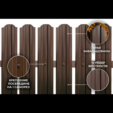Металлический штакетник KIRBO с полимерным покрытием отличается надёжной прочностью, долговечностью, невысокой стоимостью и простотой в монтаже. Планки евроштакетника имеют толщину 0.45 мм. и длину 2.0 м. Полимерное покрытие предает забору не только привлекательный вид, но и обеспечивает устойчивость к агрессивным воздействиям внешней среды, надёжно защищая металл от коррозии. Металлический штакетник изготовлен на профессиональном оборудовании только из качественного металла российских производителей. Верх полукруглый, края завальцованы, М-образный профиль, крепление - всего 2 самореза на планку.