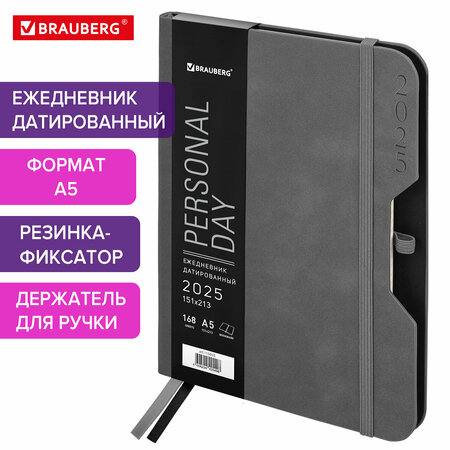 Датированный ежедневник BRAUBERG "Note" 2025 - это идеальный деловой аксессуар для тех, кто ценит качество и функциональность. С его помощью вы сможете эффективно планировать каждый день года 2025. Выполненный в формате А5, этот ежедневник станет незаменимым помощником как в офисе, так и на выездных встречах. Ежедневник 2025 оснащен 168 листами кремовой бумаги плотностью 70 г/м2, каждая страничка которых имеет перфорированный угол для удобства. Стильная обложка, стилизованная под кожу, не только приятна на ощупь, но и подходит для горячего тиснения, что позволяет сделать его по-настоящему уникальным. Дополнительно, ежедневник снабжен резинкой-фиксатором, предотвращающей случайное открытие, и держателем для ручки, что особенно оценят деловые люди. Этот планер-ежедневник станет отличным подарком как мужчине, так и женщине, благодаря своему универсальному дизайну и высокой функциональности. Ежедневник BRAUBERG "Note" - это не просто канцелярский товар, а надежный инструмент для планирования, который поможет вам быть организованным и сосредоточенным на достижении целей в течение всего года. • Тип ежедневника: датированный. • Формат: А5. • Обложка: под классическую кожу. • Вид обложки: твердая. • Количество листов: 168 шт. • Особенности: закладка-ляссе, перфорация уголков, скругленные углы, справочная информация, фиксатор для ручки. • Серия: Note. • Год: 2025. • Тип застежки: резинка-фиксатор. • Основной цвет обложки: серый. • Дополнительный цвет обложки: нет. • Цвет среза: кремовый. • Цвет внутреннего блока: кремовый. • Плотность внутреннего блока: 70 г/м2. • Высота строки для записи: 4 мм. • Тип крепления: сшивка. • Печать блока: 2 краски. • Подходит для блинтового тиснения: да. • Подходит для тиснения фольгой: да. • Подходит для заливки полимерной смолой: да. • Подходит для УФ-печати: да. • Подходит для тампопечати: да. • Длина: 213 мм. • Ширина: 151 мм. • Толщина: 20 мм. • Артикул производителя: 115933.
