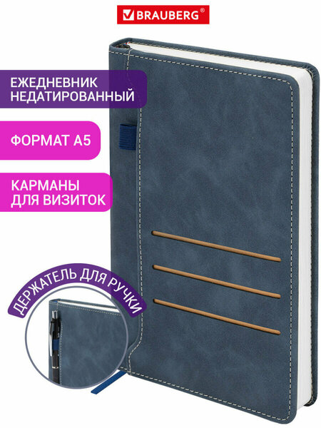 Ежедневник недатированный А5 138х213 мм, блокнот для записей 160 листов с держателем для ручки и карманами на обложке, планер планинг, записная книжка, обложка под кожу синяя, Brauberg, 116607