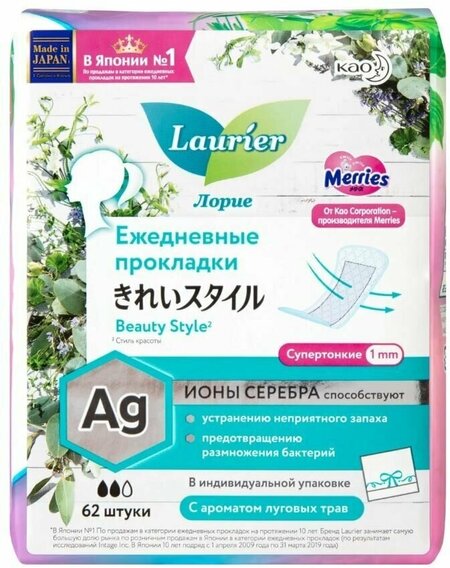 В «особые» дни жизни каждой женщины кожа в интимной зоне может становится сверхчувствительной и уязвимой к стрессу и раздражению. Верните коже ощущение комфорта и нежности с Японскими прокладками Lauries® . Прокладки Lauries® нежнее обычных прокладок, благодаря уникальному волнистому верхнему слою, который позволяет сократить трение и раздражение на коже, поверхность пропускает воздух и быстро впитывает выделения, и Вы испытываете ощущение чистоты, сухости и комфорта в любой день месяца с прокладками Lauries® . почувствуй заботу и нежностЬ С японским прокладками Lauries® . Laurier Beauty Style Fresh — гигиенические прокладки для ежедневного использования, обладающие легким ароматом луговых трав. В состав гигиенических прокладок входят ионы серебра, которые способствуют предотвращению размножения бактерий и устранению неприятного запаха Супертонкие прокладки с прочным стеганым покрытием легко принимают форму белья и хорошо прилегают к телу, исключая протекание и при этом обеспечивая безупречный комфорт. Они эффективно впитывают выделения, позволяя в течение всего дня чувствовать только чистоту и свежесть. Впитываемость: 2 капли