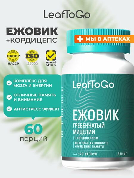 Ежовик гребенчатый LeafToGo — идеальное решение для тех, кто стремится к гармонии тела и ума. Этот суперфуд нового поколения сочетает высокое качество, эффективность и натуральный состав. Один из самых известных лекарственных грибов в виде капсул создан для комплексной поддержки здоровья. Продукт содержит гриб ежовик гребенчатый мицелий, также известный как Lion’s Mane ежовик, стимулирует рост нейронов, поддерживает ясность ума и эмоциональное равновесие. Благодаря этому он часто рассматривается как натуральные антидепрессанты от депрессии и эффективное успокоительное средство растительного происхождения. В одной капсуле содержится комплекс витаминов, способствующий улучшению когнитивных функций, восстановлению нервной системы, укреплению иммунитета и оздоровлению кишечника. Этот ноотроп полезен не только для мозга, но и для похудения, ведь способствует нормализации обмена веществ и общему тонусу. Ежовик кордицепс повышает выносливость, поддерживает дыхательную и сердечно-сосудистую системы, а также заряжает энергией. Именно поэтому данная формула входит в число востребованных витамин для памяти и мозга взрослым. Эффект от приёма: Для нервной системы: снижает стресс, тревожность и внутреннее напряжение. Витамины для сна: помогает засыпать и способствует восстановлению глубоких фаз. Для концентрации: улучшает внимание, память и адаптацию к стрессовым ситуациям. Витамины для иля иммунитета: усиливает естественную защиту организма. Для ЖКТ: действует для кишечника, нормализуя пищеварение и микрофлору. Ежовик гребенчатый капсулы — это безопасные ноотропы для мозга, натуральные антидепрессанты и поддержка организма в одной баночке. Продукт зарегистрирован в системе Честный знак и полностью соответствует требованиям качества.