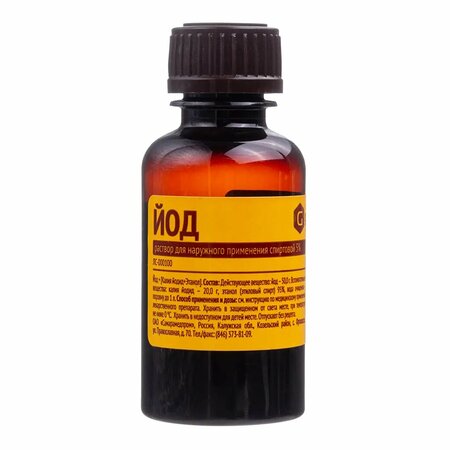 Действующее вещество: Йод кристаллический – 50 г. Вспомогательные вещества: Калия йодид – 20 г, Этанол (спирт этиловый) 95% – 500 мл, Вода очищенная – до 1000 мл.