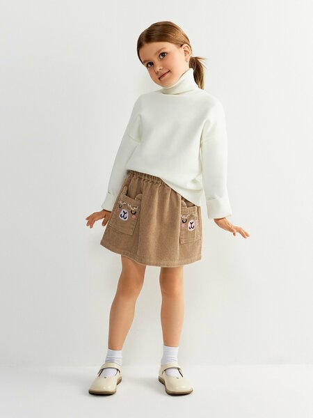 Юбка для девочки выполнена из вельвета. Модель прямого силуэта, длиной до середины бедра, сочетает в себе стиль и комфорт. Эластичный пояс в стиле paperbag обеспечивает удобную посадку и позволяет легко надевать и снимать юбку. Этот фасон подчёркивает талию, добавляя образу дополнительный акцент. Мягкий вельвет делает юбку приятной на ощупь, а прямой крой обеспечивает удобство в движении, делая её отличным выбором для активных девочек. Спереди юбка украшена накладными карманами с милыми ушками и дизайнерской вышивкой, что придаёт модели игривый и оригинальный вид. Юбка идеально подходит как для повседневной носки и легко сочетается с базовым лонгсливом ил свитером.