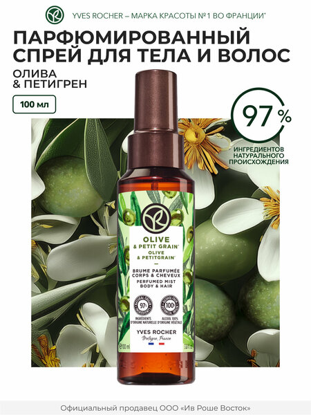 Парфюмированный спрей для тела и волос содержит 97% ингредиентов натурального происхождения. Ароматизированный мист придает стойкий нежный аромат коже и волосам. Мы в Ив Роше выбрали солнечную Оливу и эфирное масло Петигрена из бассейна Средиземного моря. Полученное путем дистилляции листьев и ветвей померанцевого дерева, это масло известно своими расслабляющими свойствами. Ароматизированный спрей с пленительным цветочным запахом не сушит кожу, не оставляет жирной пленки или блеска, придавая ощущение легкости и комфорта. Уникальная формула делает его отличным выбором в качестве подарка для девушек и женщин в день рождения, 8 марта или другие праздники. Легкость в использовании позволяет наносить средство по мере необходимости на чистую кожу или волосы. Мист создает ощущение ухоженности и нежности, подчеркивая вашу индивидуальность в любом образе! *Источник: Kantar Worldpanel. Совокупность женщин покупателей за весь период 2022 года (данные по состоянию на 25.12.2022). № 1 в штучном и стоимостном выражении.
