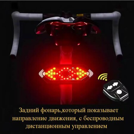 Задний фонарь, который показывает направление движения, с беспроводным дистанционным управлением. Пять режимов освещения: 1. Всегда ярко красный свет 2. Левый указатель поворота 3. Мигающий красный свет 4. Правый указатель поворота 5. Все мигает Беспроводной пульт дистанционного управления, прост в эксплуатации. Звуковой сигнал с высоким уровнем ДБ для безопасной езды на велосипеде в ночное время. Материал корпуса: ABS Цвет корпуса: черный Свет: 14 красных светодиодов SMD и 18 желтых светодиодов SMD Размер: 94x32,5x26 мм Емкость аккумулятора: литиевая батарея 900 мАч Время зарядки: 3 часа Время разрядки: 36 часов Существует два направления установки основания пульта дистанционного управления и заднего фонаря. Вы можете выбрать угол установки, который вам нравится. Диагностика проблемы: 1. Если пульт дистанционного управления не работает, сначала проверьте, будет ли пульт излучать свет после нажатия. Если он не излучает свет, это может означать, что батарея разряжена или у батареи плохой контакт. Извлеките и переустановите батарейку пульта дистанционного управления или попробуйте новую батарейку-таблетку CR2032. Комплектация велосипедный фонарь – 1 шт; пульт дистанционного управления – 1 шт; комплект аксессуаров
