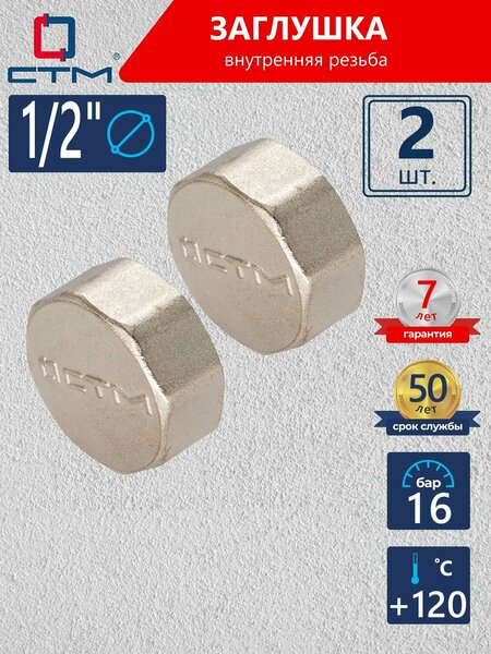 Заглушка с внутренней резьбой 1/2" CTM изготовлена из горячепрессованной латуни и имеет шестигранную головку. Используется для закрытия трубы в системах холодного питьевого водоснабжения, горячего водоснабжения, хозяйственного водоснабжения, отопления, сжатого воздуха, технологических трубопроводах, транспортирующих жидкости и газы, неагрессивные к материалу корпуса и уплотнений изделия. Шестигранная форма заглушки подходит для любых ключей, что облегчает её установку. Материал: латунь с никелированным покрытием Резьба: внутренняя Давление: 16 бар Рабочая температура: от -20°С до +120°С