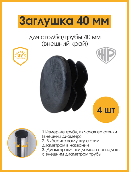 Заглушки пластиковые внутренние с толстой плоской шляпкой для круглых профильных труб с наружным диаметром 40 мм и толщиной стенки 1.0-3.0 мм. Заглушка 40 мм используется для металлоконструкций: заборов, ограждений, беседок, козырьков, спортивных и детских комплексов, а также для мебели из металла: стула, стола, стеллажа, лестницы, кровати, офисной мебели и других металлических конструкций. Применяется в строительстве как завершающий декоративный элемент и в мебельном производстве как опоры - накладки на ножки мебели. Плоская и прочная шляпка позволяет использовать заглушку в качестве опоры для металлической мебели, мебельного протектора для ножек стола, стула и табурета. А также дивана, кресла, кровати. При строительстве заборов пластиковая заглушка используется для предотвращения попадания воды, насекомых и мусора во внутреннюю полость заборной трубы, а также для декоративных целей. Рекомендуем защитить столбы / трубу заглушкой сразу после монтажа. Это предотвратит попадание воды в полость трубы, появление ржавчины и облегчит монтаж заглушек.
