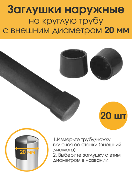 Заглушки пластиковые наружные для трубы / ножки стула с внешним диаметром 20 мм . С помощью накладки на круглую ножку вы легко сможете обновить мебель, придать ей законченный вид и продлить ее срок службы. Декоративные заглушки для труб защищают пол от царапин и повреждений. Также защитные колпачки оберегают мебельные ножки от деформации и износа. Плоская и прочная шляпка подкладки под мебель позволяет использовать заглушки из пластика в качестве опоры для металлической и деревянной мебели. Мебельный протектор подойдет для ножек стола, стула, табурета, дивана, кресла, стеллажа, лестницы, штатива и других предметов. При использовании на уличных конструкциях пластиковые заглушки для труб препятствует попаданию воды и пыли внутрь трубы, тем самым увеличивая срок службы трубы и сохраняя ее внешний вид. Заглушки внешние 20 мм успешно применяются как колпачки для трубы для уличных металлоконструкций: заборы, ограждения, беседки, козырьки, оградки.