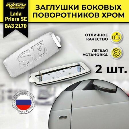 Заглушки SE предназначены для установки вместо боковых поворотников на крыльях автомобилей линейки ВАЗ/Lada. Комплект из 2 шт. В нашем магазине KYZOVNOY есть возможность прибрести элементы внешнего тюнинга, в том числе заглушки в комплекте из двух штук или поштучно в черном цвете и хромированные. Заглушки поворотников клеятся к крыльям на трехсторонний скотч, порядок установки на авто: -Снять поворотник, а лампочку оставить в крыле, для того, чтобы поворотник быстро не моргал (Если нет повторителя на зеркалах). -Обезжирить место, куда будет клеиться заглушка. -Снять защитную пленку с заглушки. -Приклеить на место. Нас можно найти по тегам: бампер и поворотники, заглушки в машину и внешний тюнинг. Повторитель поворота и Приора. Lada/ваз и Гранта. ВАЗ 2109 и ВАЗ 2115. Приора 1 и лада приора. Авто товары, аксессуары для авто и запчасти на lada/ваз и другие марки автомобиля Вы сможете найти в нашем магазине автозапчастей Кузовной!