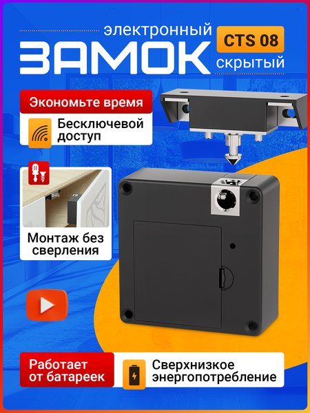 Скрытый замок TAYMLUX GS-CTS08 имеет скрытое исполнение, применятся для дома, офиса, спортзалов, саун, в торговых павильонах и для других коммерческих и жилых помещений. Наш замок для шкафчика - это эффективное современное решение в случае, если необходимо замаскировать потайное пространство или просто закрыть его от детей. Этот замок накладной для двери имеет достаточно широкое распространение. Наш замок накладной отлично подходит как для защиты от детей, так и для сохранности ценных вещей, находящихся в Вашем доме. Данный электромагнитный замок устанавливается на деревянные или металлические шкафчики как на выдвижные, так и на обычные дверцы. Этот умный замок устанавливается только на внутренние поверхности деревянных дверей. При установке, не требуется сверлений сквозных отверстий, поэтому, наружная поверхность дверцы шкафчика остается без каких либо изменений. Наш умный замок дверной устанавливается так, что о его наличии знает только владелец шкафчика. Работает электронный замок от 4-х батареек тип ААА или от источника питания 5В с круглым разъемом 2мм. Такой электронный замок на дверь имеет достаточно длительный срок службы, автономность работы от 4 пальчиковых батареек составляет порядка 12 месяцев. Замки на ящики от детей оснащены конструкцией, которая позволяет ставить замок мебельный в нескольких положениях относительно ригеля, что очень удобно в маленьких шкафчиках. Срабатывание ключ-карты происходит уже в 50 мм от электромеханического замка, что позволяет ставить данный замок на толстые межкомнатные двери. После прикладывания ключа, замок электромеханический остается открытым 10 секунд, после чего закрывается. При приближении остатка заряда батарей к критическому, устройство будет подавать звуковой сигнал при открывании электрозамка. Крепится замок для шкафа на 4 самореза (идут в комплекте). Замок от детей для шкафа разработан специально для небольших пространств. Замок для сейфа имеет следующие габариты (75х75х30 мм), которые позволяют удобно располагать скрытый замок как при вертикальном, так и горизонтальном типе установки, не нарушая при этом эргономику использования пространства. Этот скрытый замок для шкафа имеет инструкцию для записи нового ключа: Вы можете взять любые ключи - например, просто сходить и сделать дубликат от своего домофонного ключа, далее нажимаете на кнопку сброса (на задней стороне замка в углублении) и держите 3 сек, далее прислоняете новый ключ, будет создан мастер ключ (админ ключ), им уже можно пользоваться не удобно, так как после открытия замок будет сигналить 10 секунд, для более удобного использования Вам лучше сделать 2 ключа, что бы второй ключ записать как пользовательский, для этого нужно просто поднести ключ мастер(админ) к замку, а далее пока раздается сигнал в течении 10 сек поднести второй ключ и убрать его и дождаться окончания сигналов. После этого у Вас будут работать 2 ключа. Используя скрытый электронный замок, вы всегда можете самостоятельно закодировать дополнительные брелоки. Наш невидимый замок не предназначен для использования на улице, нет защиты от влаги. Надежный и долговечный замок без ключа поможет вам сохранить ваши ценные вещи в безопасности и под контролем. Он имеет гарантию 3 года - надежность нашего магазина.