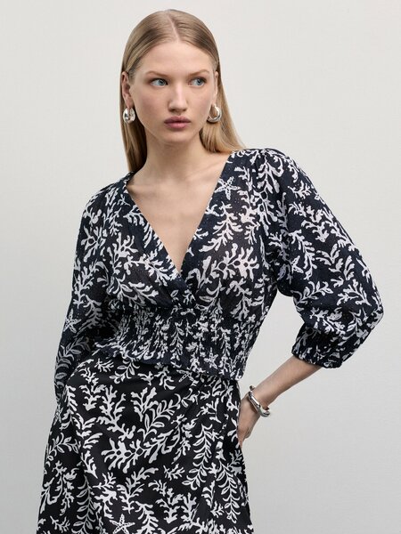 Эта женская блузка создана для тех, кто ценит элегантность и стиль. Приталенный крой подчеркнет изящные линии фигуры, а V-образный вырез добавит нотку изысканности. 3/4 рукав делает эту блузку универсальной - она подойдет как для повседневных образов, так и для особых случаев. Принт на данной блузке - это настоящее произведение искусства. Цветы, изображенные на ткани, придают изделию особый шарм и женственность. Такая деталь добавит неповторимости вашему образу и подчеркнет ваш индивидуальный стиль. Нарядная блузка с принтом и вырезом - отличный вариант для тех, кто хочет выглядеть стильно и безупречно в любой ситуации. Ее утонченный дизайн позволит вам чувствовать себя уверенно и привлекательно! Параметры модели на фото 78-61-91, Размер на модели S, Рост модели 174