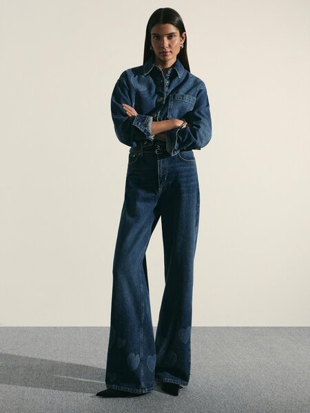 Составь комплект: Джинсовая рубашка с узором "сердце" 5993950815 Джинсы wide leg с высокой посадкой - это идеальный выбор для всех любителей стильной и современной одежды. Изготавливаются из 100% хлопка без добавления эластана, что обеспечивает высокую плотность материала и долговечность изделия. Эти плотные джинсы станут отличным выбором для повседневного использования. Эти джинсы wide leg с узорами "сердце" идеально подходят для создания женственного и романтичного образа. Уникальные узоры сердца придают вещам игривый и нежный вид. Такой дизайн легко сочетать с различными верхами, будь то лёгкая блузка или простая футболка. Эти джинсы имеют широкий крой, что создает неповторимую гармонию между модными трендами и комфортом. Карманы выполнены с учетом функциональности, позволяя удобно разместить мелкие предметы. Молния на передней части обеспечивает классическую застежку. Шлевки позволяют добавлять ремень для завершения образа или дополнительного комфорта. Благодаря своему дизайну и качественным материалам, эти штаны будут сидеть идеально на любой фигуре. Необычный фасон подчеркнет вашу фигуру и создаст эффект сбалансированности и элегантности. Джинсы wide leg - это шикарный предмет гардероба, который позволяет выразить свою индивидуальность и стиль. Специально разработанная высокая посадка создает ощущение комфорта и удобства, а также поддерживает и подчеркивает вашу фигуру. Джинсовые брюки идеально подходят для повседневного образа или для особых случаев. Благодаря своему street стилю и дизайну, они станут отличным дополнением любого аутфита. Они доступны в больших размерах, что позволяет каждому покупателю найти оптимальную посадку.