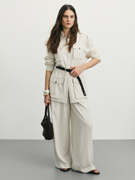 Составьте комплект: Удлиненный жакет 4433459349 Брюки палаццо с добавлением льна — это воплощение элегантности и комфорта для теплых дней. Они идеально подходят для создания стильных повседневных и деловых образов. Эти брюки изготовлены из мягкой и приятной на ощупь ткани, в составе которой — вискоза, лён и хлопок. Лён придаёт изделию особую текстуру и обеспечивает хорошую воздухопроницаемость, а вискоза добавляет мягкости и лёгкости. Брюки оснащены удобными карманами в шве и застёжкой молнией. Средняя посадка и защипы обеспечивают комфорт и свободу движений, а широкие штанины создают изящный силуэт. Особенностью этих брюк является их универсальность. Они подходят для создания разнообразных образов — от деловых до повседневных. Благодаря своему стилю и дизайну, брюки палаццо станут отличным дополнением к вашему гардеробу и помогут создать множество интересных и запоминающихся образов. Сочетайте брюки с блузами, рубашками или топами. Они гармонично смотрятся как с каблуками, так и с комфортной обувью на плоской подошве. Эти брюки — прекрасный выбор для работы, встреч с друзьями или прогулок по городу.