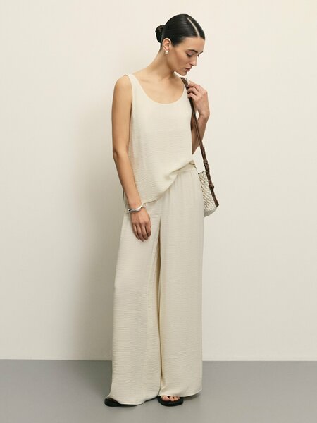 Составь комплект: Топ из жатой ткани 51345483395 Женские брюки-палаццо из фактурной ткани станут отличным выбором для создания комфортных и стильных образов. Изделие выполнено из жатой легкой ткани, что делает его легким и подходящим для теплого времени года. Средняя посадка обеспечивает удобную посадку на фигуре. Модель отличается свободным прямым кроем и широкими удлиненными штанинами, которые подчеркивают расслабленность силуэта. Отсутствие застежек и карманов добавляет лаконичности дизайну, а пояс на резинке обеспечивает комфорт в носке. Эти базовые брюки идеально подходят для повседневного гардероба и универсально комбинируются с различными элементами одежды. Летние брюки создают эффектный силуэт, оставаясь при этом практичными для ежедневного использования. Легкая в уходе ткань подчеркивает непринужденность стиля. Подходят как для прогулок или отдыха, так и для деловых образов в офисной обстановке. Их расслабленный крой делает модель универсальной базой для любого случая. Широкий размерный ряд до 3XL позволяет подобрать идеальный вариант для любой фигуры.